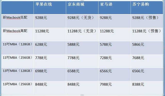 苹果轻薄产品系列价格一览 就像笔者之前所说,很多有钱人也不希望花冤枉钱,他们选购产品也会货比三家,而Macbook产品究竟在哪家最便宜呢?除了苹果官方的在线商城,笔者选择了如今最有代表性的三大电商平台——京东商城、亚马逊商城和苏宁易购。 通过上述苹果轻薄系产品价格表中,我们看到新Macbook在每家的售价完全相同,但如今只有苹果在线和亚马逊商城有现货在出售。而Macbook Air每家的售价则完全不同,通过直观的价格信息你可以看到亚马逊商城的价格是最具有优势的。