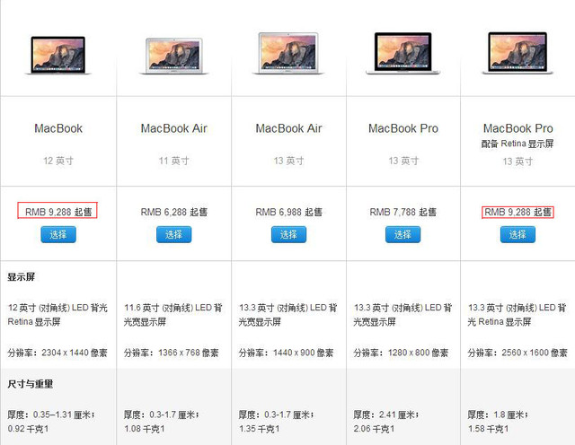 从图中可以看出此次苹果并没有对普屏版Macbook Pro进行更新 说完了小众化的15吋Retina Macbook Pro,接下来我们来聊聊这六大系列哪款最不值得选。在笔者来看应该归属于13吋Macbook Pro(非视网膜),从去年就有消息宣称苹果要放弃非视网膜版的13吋Macbook Pro,虽然产品依旧在出售,但我们已经看到了苹果的“不上心”,因为此次处理器升级似乎苹果把这个产品线给遗忘了,也就是说其搭载的并不是第五代酷睿平台,而且入门机型只采用了500GB 5400转速的机械硬盘,性能低、速度慢、价格偏高,以至于就算你富可敌国也不应该花近8000元的价格买这么一台可能很快会被苹果淘汰的产品。 3、三大轻薄阵营 三个维度下的精细化选购方案 说完了大尺寸Macbook Pro的针对人群,淘汰了普屏版Macbook Pro,接下来这个舞台显然就将留给苹果移动PC最为核心的三大系列——新Macbook,Macbook Air以及13吋Retina Macbook Pro。 这三大系列有一个共同特点,那就是都是打着轻薄标签,因此如果你的应用初衷是游戏,客观来说就可以关上这一页的文章了。最近一段时间笔者被问的最多问题是:新Macbook和13吋Retina Macbook Pro到底应该选哪个?因为两者的起售价完全相同,同为9288元。