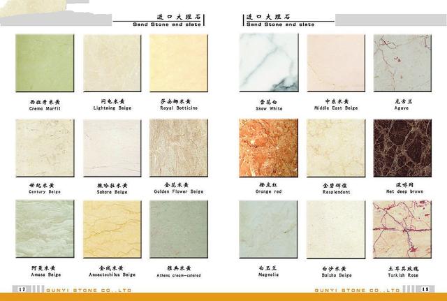 1、大理石: 是岩石经长期的自然作用,组织结构均匀,线胀系数极小,内应力完全消失,不变形。大理石的硬度高,耐磨性比较好。寿命也比较长,维护和保养方便、简单。不会出现划痕,在室内起到了装饰空间的作用。 室内的墙面、楼梯走道、地面等都善用大理石,也可以用于制作家具台面和室内外家具。