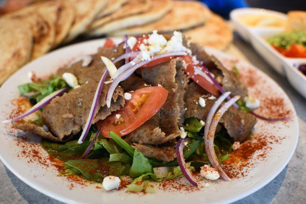 Gyro(希腊) Gyro是一种希腊肉制品,里面的肉传统上是用羊肉、鸡肉或猪肉做成的,使用垂直烤肉的方式烹饪,然后切成薄片,和番茄、洋葱以及酸奶黄瓜酱一起作为馅料放在大饼(通常是皮塔饼)里食用,有时也会加入炸薯条。