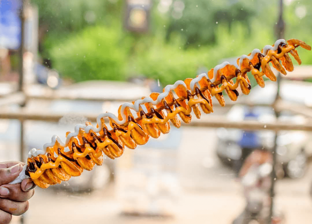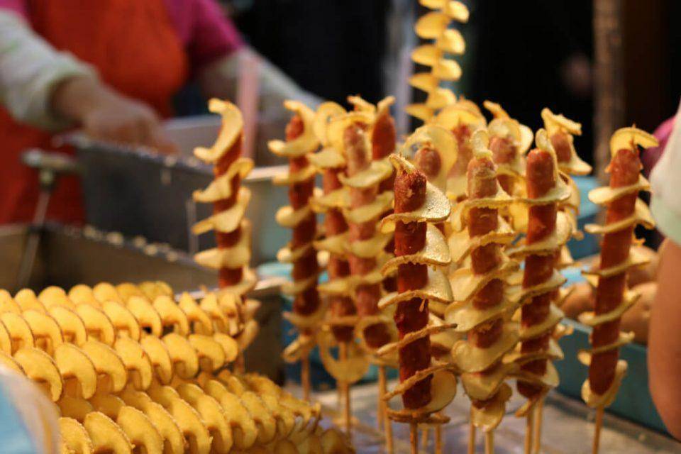 旋风土豆(韩国) 旋风土豆在近些年来也流传到了我们国内,这是一种流行的韩国小吃,把整个土豆串起来形成螺旋状,然后油炸,涂上奶酪、蜂蜜或洋葱等调味料。