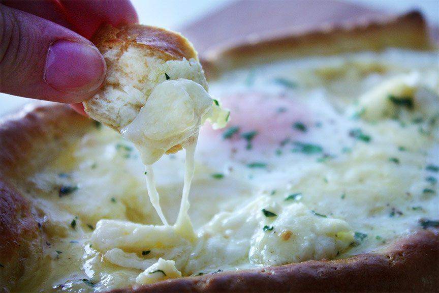奶酪面包(格鲁吉亚) 奶酪面包是格鲁吉亚的经典美食,这是一种充满奶酪的面包,面包的形状各异,中间装着奶酪,可以把面包皮撕下来蘸着奶酪吃,有时候,里面也会加入鸡蛋作为馅料。