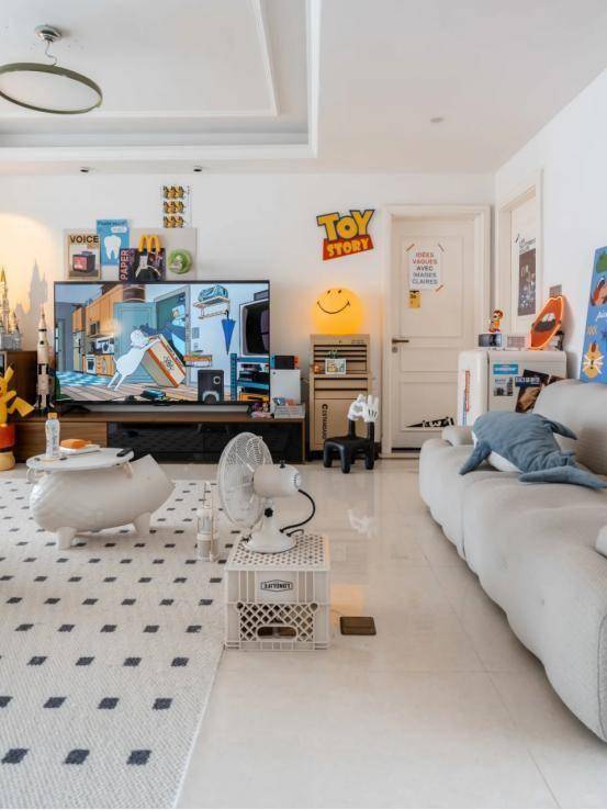 不止如此,我们还可以尝试大白墙,然后在此基础上添置置物架、画框等,既能收纳又能起到美化的作用。
