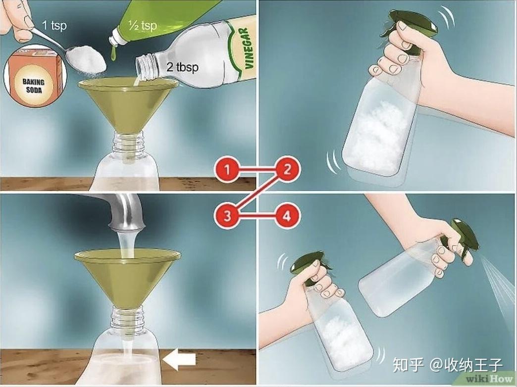 配方一:5g小苏打+2.5ml洗洁精+30ml醋,摇晃产生泡沫后灌入喷壶,将喷壶剩余的空间加温水至满。 配方二:1/4杯温水+29.6ml醋混合,倒入1/4杯小苏打,混合至起泡。 使用方式:将要清洁的物品喷湿,静置10-15分钟,用海绵擦干,在用干抹布擦干即可。 卫生间清洁工具的收纳看这里~ 玄 关