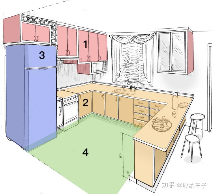 用厨房来举例,适合打扫顺序是,如图所示的:吊柜→地柜→冰箱→地板。 这么安排顺序是因为在“摊开-分类-收起来”这三个步骤中,摊开时需要把吊柜、地柜、冰箱中的物品拿到厨房操作台面上,再擦拭柜内空间。然后再完成分类、收起来。最后打扫厨房地面就可以了~
