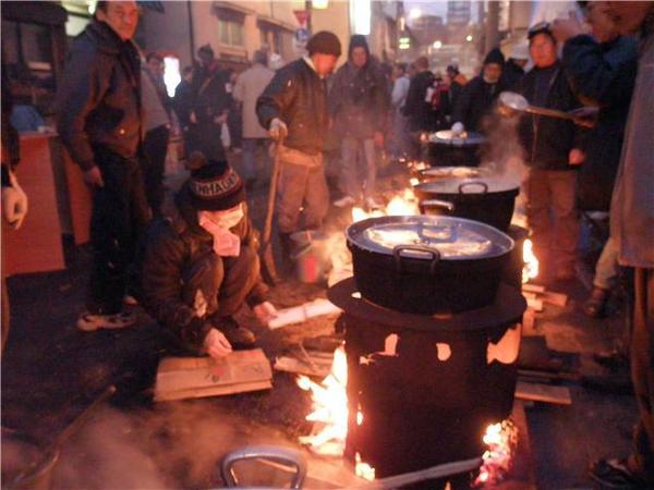 新年毕竟是节日,越冬斗争的人们也会想方设法营造出温暖的气氛,让流浪者和劳动者也能快乐地度过这段时间。越冬祭除了每年在三角公园搭建舞台、请来各路歌手和乐队(当然鲜有特别出名的大牌明星)过来表演,以及邀请社会人士前来演讲,还会举办乒乓球比赛之类的文娱活动。
