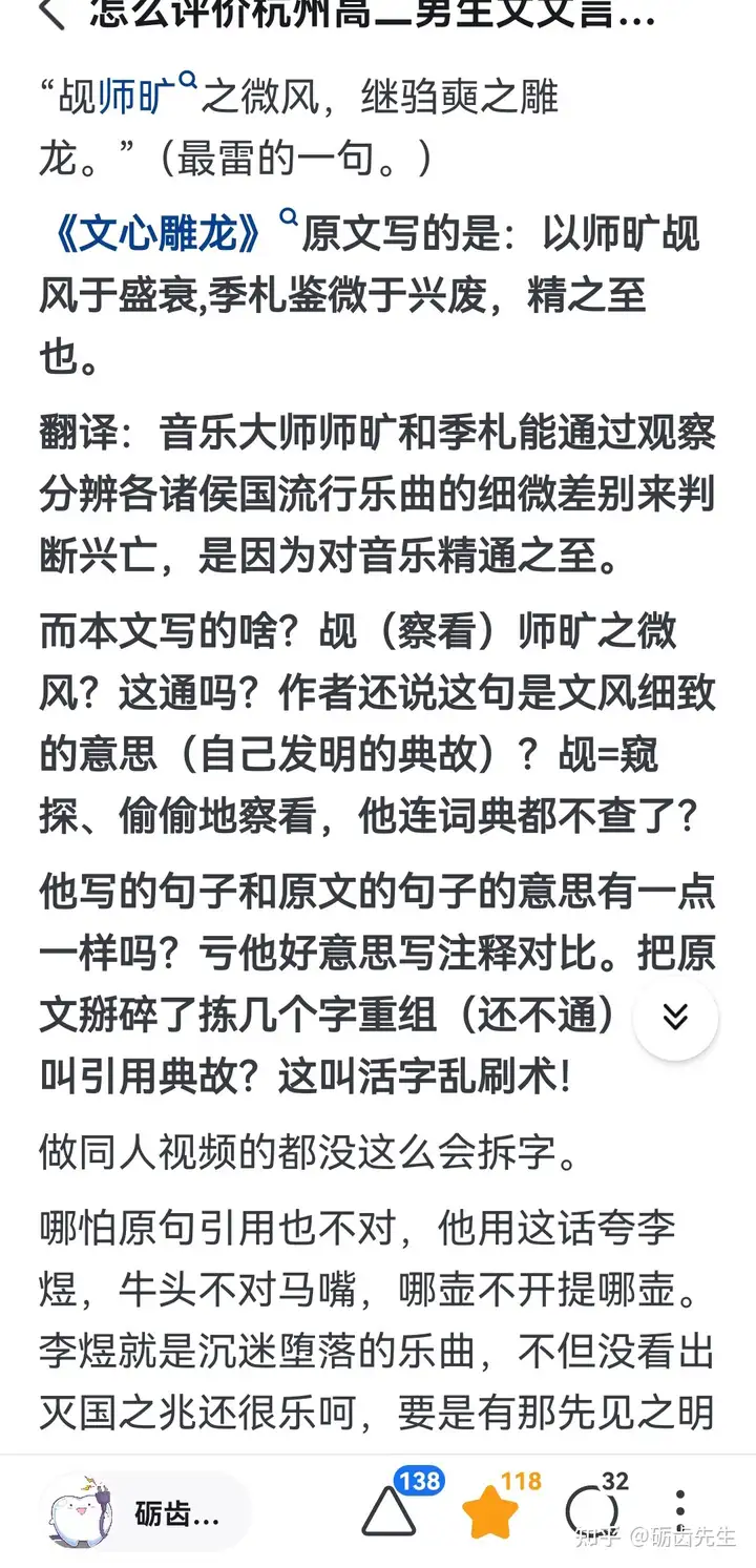 我纠错贴的评论区还有几个理科人士认为《小周后赋》压根不是活人写的,是用AI写的,chatgpt的痕迹明显,并说用AI检测工具可确定。我对这方面不熟,请诸位评议。想想确有嫌疑,其中很多生造词和起名网起的名字一样,起名网的原理也是用ai。 笔记笑话:《赋赠小周后》 作者:砺齿先生(转载请注名,抄袭必纠) 余杭城有陈生者,家世不凡,能薄而颜厚,腹中草莽而强趋风雅,好弄文藻。教习阿其所好,每多溢美之言,张扬于外。生承虚名,自鸣得意,路人蔽之甚矣。 一日,生读南唐书,思及小周后才色双绝,遂生邪情,想入非非,因赋艳词一篇,苦搜枯肠,极尽卖弄酸气之能事。书既毕,生自喜,捧览不已,榜于其馆垣,寻过路夫子品赏。 其文不合体例,不成章法,条理不通,音律不协,言不谙典,词不达意,瘠义肥辞,空疏浮脃,矫饰做作,诘屈聱牙,生造硬语,一塌糊涂,照猫画虎,西颦东效,驴唇马嘴,漏洞百出。更兼题旨轻狎,美其名曰惜玉怜香,实则唐突佳人。 其中写道朔日月明,又将四时风物、雅俗之乐混作一谈。不分古今装束,不识家常器具,不辨百工之别,荒谬绝伦。正可谓朝菌不知晦朔,蟪蛄不知春秋也者。 一夫子性直梗,见之谑曰:“芝麻通鉴,零语积得。夜航船中,贫僧伸脚(jio)。离赋千里,近乎作贼(ze)。” 生固愚顽,亦知似涉讥诮,面上不堪,作色道:“莫非眼热余之高才乎。” 是夜,生梦一美妇,灵姿窈娜,仙步苒袅,转睛流目,秋波一段。妇以素手招之,生蒙蒙然忘乎所以,尾其后而去。 少顷,行至一楼阁,花簇锦攒,匾曰“锦洞天”。妇启户,生欣然随入,但见阁内,流丹溢翠,堆金迭玉,遍布四节之奇葩,齐聚五洲之重宝,殊异于世。生为之迷眩,目不能移。 妇睇眄之,忽发一哂。生愈加心醉,不觉有异。妇乃取绖带,缚生双手,绸缪束之。生以为撩拨,春意蠢动,匿笑不禁,急与为戏。妇色乍变,擣之,生瞠惑。 妇含悲衔愠,詈曰:“不当人子。既知奴命苦,千载之下,竟还不肯饶。贼子何故跳梁乎井干之上,这般折辱于我,好不晦气!莫说是曾经沧海,遮末不曾见沧海,又焉能与埳井之蛙相首尾。” 生见状,还欲狡赖,摇头摆手,称冤诉苦。妇怒火尤盛,道:“且休逞舌,龌龊文章我已亲见,白纸黑字,你却哄谁。你若认下,还是条汉子,敢做不敢当,真真鼠辈。小子着实看轻了我也!” 语罢,妇欲批生颊。生两手受缚,不便相搏,仓惶走避之,误触一人,其人长喟曰住。 生定睛观之,来者衣冠济楚,重瞳异象,正是词中南面王耳。 词帝顾生,谇曰:“儿戏笔墨,无知无礼,揭人疮疤,不与你计较便了。轻辱室人,是可忍孰不可忍!” 生不及遮辩,词帝抵视之,复道:“治不住二赵还治不得你?读书人岂无三分火性,误国侯未必一世柔懦。还要容后生竖子作践某家坟茔不成?”遂攘捲,箝生腕,劲力非常。生吃痛哀呼,无以捽脱。 词帝拊之仆地,生技穷告饶,帝嗤曰:“不推了你,已是慈悲。” (推:夺取对方生命。想歪的去面壁。我故意的。) 又叱道:“尔岂不闻金错刀、撮襟书之名号乎?今日凭尔一见。”便引生衿,掼之于阶。妇一旁鼓掌称快,曰:“跌得好,再跌狠些。” 生狼狈挣起,掉头鼠窜,悚栗踉跄,登时跌空,方才梦醒,滚下床来。乃觉齿颌俱摺,腕上赫然有淤痕,沦肌浃髓。久之,膏散弗能治。 同窗闻其事,皆诟病,戏称:“雕栏玉砌应犹在,碰得满面挂彩。” 尔后,生终身不第,时人谓因果也。 嘻!怪哉斯事!大凡少艾,痴慕美人,古来何多,无可厚非。然则,拟妖讹诞谩之句,铺蔑伦悖理之章,就yin冶卑靡之篇,播于广庭,斯文扫地,又或指鹿为马,以惑众听,伤化败俗,断不可取。 小说家言,帝辛信笔亵娲皇,江山犹易主,虽为戏说,亦彰正理。 称誉诈伪以乱人,欺世盗名终祸己。 笔者辨谎,敢告天下,诸君自当戒鉴,居敬慎德,休起妄念,莫效覆车。 (正文完) 《赋赠小周后》全文大意(意译,非直译): 余杭城有个姓陈的书生,家境好,不学无术,肚里没货,却强行附庸风雅,喜欢写堆砌词藻的文章。老师经常吹捧他,还把夸他的话宣扬了出去。他出了名,自以为得意,看热闹的外行路人都被蒙蔽,以为他多有文才。 有一天这书生读南唐史书,想到南唐小周后(李后主之妻)又漂亮又有才华,就想歪了,觉得自己配得上小周后。他就写了一篇香—艳的酸文,搜刮肚子里本来就不多的那点存货,使劲卖弄。 这篇文写完了,他很高兴,捧着看,爱不释手,自我陶醉,觉得自己怎么那么有才啊。他还把这文章贴在自家墙外,拉过路的有学问的人来看。 这篇文的格式音律都不对,文法条理都不通顺,词不达意,典故也用错,牛头不对马嘴,到处是错误,完全是乱写。表面文辞很多,内容却很少,其实啥也没写明白,空洞,轻浮,矫情,华而不实,言之无物,还有很多生搬硬造的无意义词句,生僻又拗口,不知道在说什么,立意还很猥琐,说得好听叫怜香惜玉,其实就是YY人家美女。 他的文里甚至还写朔日有月亮,把四季的景物搞混,雅乐俗乐都分不清,特别不合理。他分不出古今的服饰,不认识日常器具,不知道各种工艺的区别,见识短浅,没常识。 有个学问人的性格比较直,看了他的文,就嘲弄说,你这语文是在撕下来包芝麻的碎书页上学的吧,什么东拼西凑的,写得七零八碎,有上句没下句,不是人话。没什么学问的僧人遇到你这种不懂装懂的都要嫌弃。还写赋呢,你是在写贼吧,就会写偷人。这书生虽然笨,听不大懂别人引经据典的话,但至少也知道贼不是好话,是在笑话他。他脸上就挂不住了,垮下脸对那人说:“你一定是