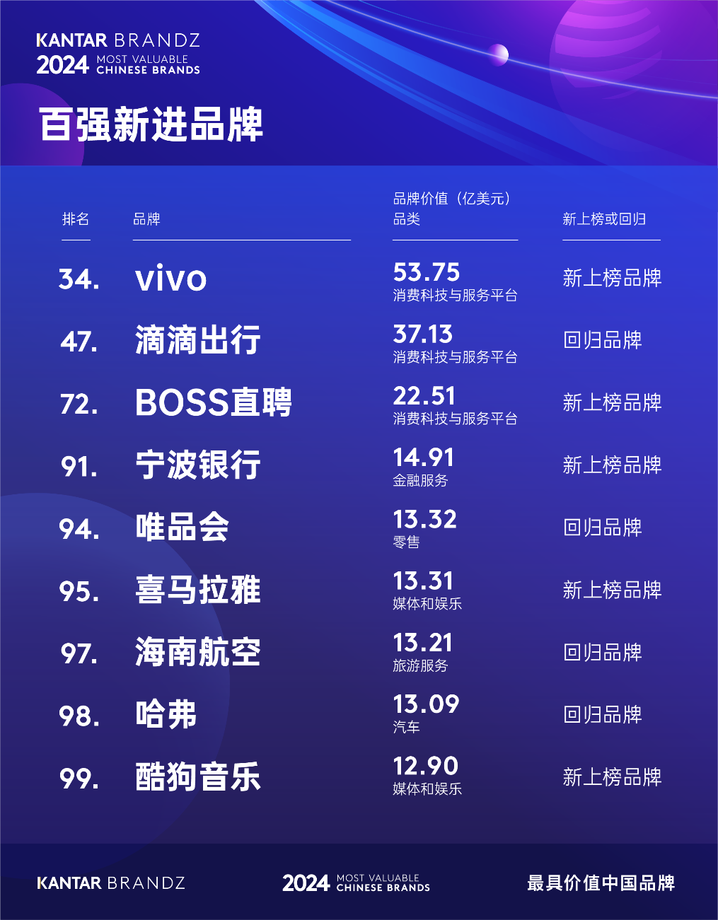 今年,品牌百强榜单迎来了九位新成员,它们或初登舞台,或强势回归。品牌价值最高的新上榜品牌是科技公司vivo(53.75亿美元),初次亮相便高居第34位。依托“用户导向”“追求极致”与“科技普惠”的理念,vivo发布技术品牌“蓝科技”,并持续通过设计、影像、系统、性能等赛道的深厚技术积累,为消费者构建出科技与生活深度融合的美好未来。滴滴出行则凭借扭亏为盈的财务表现和健康的品牌根基,位列第47位(37.13亿美元),成为今年排名最高的回归品牌。
