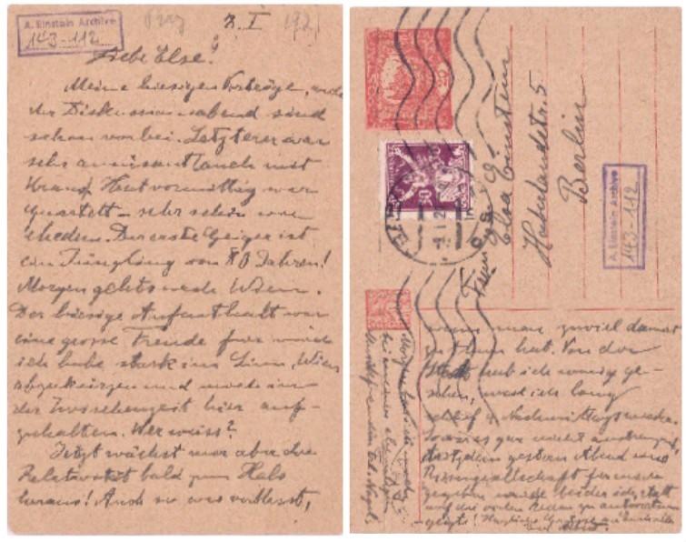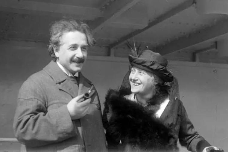 爱因斯坦与第二任妻子艾尔莎。 玛戈特1986年7月8日去世,所以希伯来大学于2006年7月10日(星期一)公开了这些信件。这些信件写于1912到1955年,有3500页之多,是爱因斯坦与艾尔莎母女的通信。在他的第二次婚姻期间,爱因斯坦只要出门在外,几乎每天都要给艾尔莎写信。