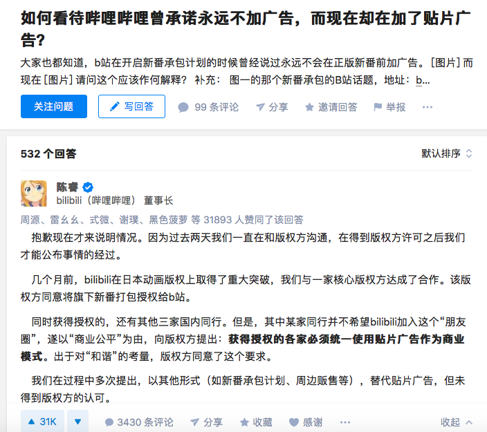 B站独特的弹幕文化 在此基础上,B站平台的每日视频播放量轻松过亿,弹幕总量可过14亿,原创UGC投稿总数也早过千万。 在B站中,最常见的一条弹幕是“我爱死这破站了”,“破站”一词无形中体现出大家对B站的深厚情感。 毋庸置疑,上亿年轻人是B站手里最大的资本,但吊诡的是B站一直以来在这些喜好二次元的年轻人身上很难赚到流量的钱。 虽在游戏代理和联运上屡试不爽、成绩不凡,但以视频起家的B站在主业视频上的收益一直都十分有限。 一个尴尬的事实是B站很难靠此流量成功实现商业化变现,用户粘性极高的二次元年轻人在用户体验上相对而言更加苛刻。 无论从贴片广告,还是会员收费模式,B站先后做了不同的尝试,但情况并不如想象的那么乐观。 去年5月份,B站开始尝试推出贴片广告等模式的商业化变现,在五部新番片头加上时长15秒的商业广告,B站创始人陈睿的解释是次添加贴片广告是应版权方要求不得以为之。 但这显然与其此前承诺的“bilbili购买的正版新番,永远不加视频贴片广告”相悖。 当时有用户在知乎提问称“如何看待bilibili曾承诺永远不加广告,现在却加了贴片广告的行为?”,此时一时间将B站推上了舆论的风口浪尖。