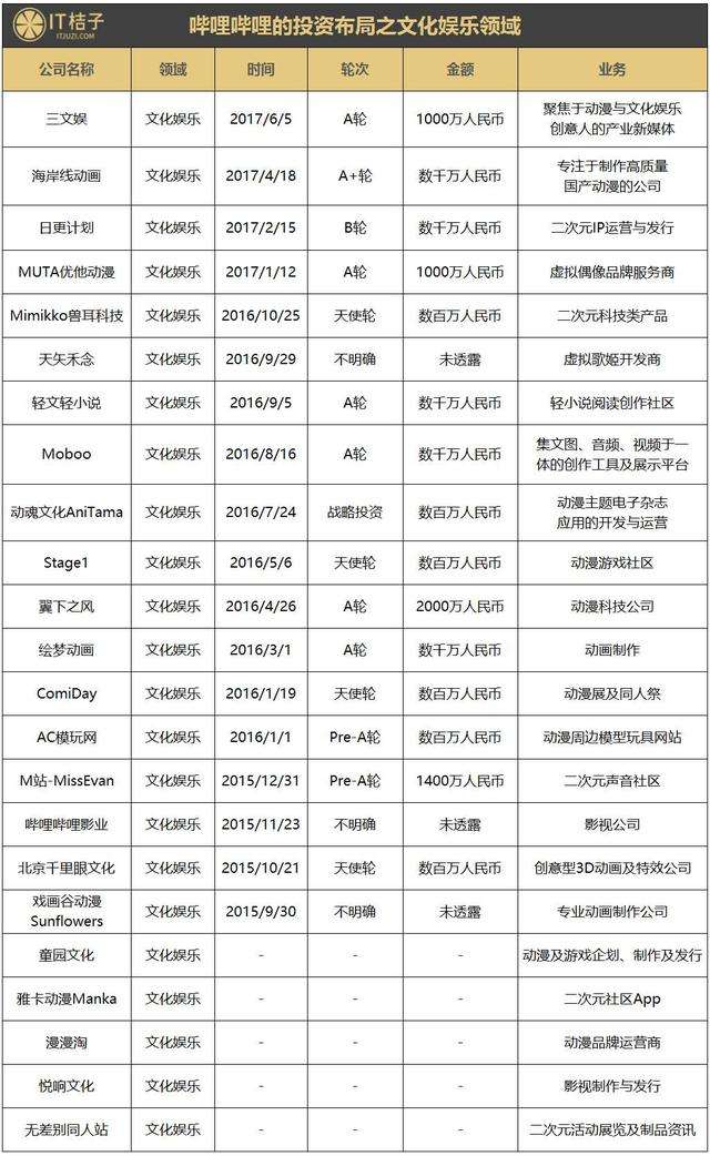 从数据上看,B站游戏代理和联运收入增速非常快,2015年B站的游戏代理+联运收入仅有1个亿,到2016年这一数字就已经达到了5.24亿元,增速高达423%。 除此之外,B站还在文娱领域围绕ACG(Animation、Comic、Game)方向频繁、重金投资,数量已超30家,主要聚焦动漫产业链上下游,以内容创作型公司为主。