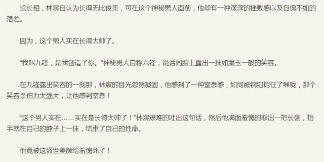 第5名,主角被作者帅死。 这个神奇的情节出自创作莫轻水的同一个作者九 锋。这本小说写到第55章的时候,作者就写不下去了,于是乎再次烂尾。在用了莫轻水被美死了的梗之后,这作者再次脑洞大开,写了一出主角被作者帅死的奇葩情节。 请大家欣赏这个神奇的片段:“‘这个男人实在……实在是长得太帅了!’林宸艰难地吐出这句话,然后他满面羞愧地取出一把长剑,抬手就在自己的脖子上一抹,结束了自己的性命。他竟被这盛世美颜给羞愧死了!”哎,我真是不服都不行,这个作者写小说没有本事,写搞笑倒是一段又一段!