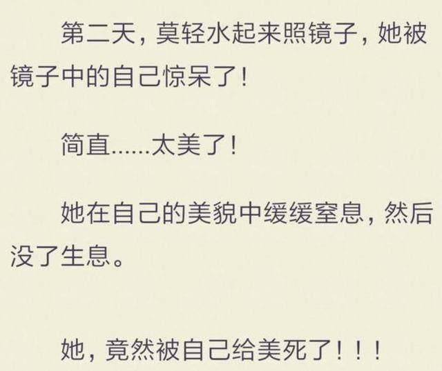 所以我必须要再召开一次莫轻水表扬大会,表扬一下莫轻水早上照镜子被自己美死了的奇迹:“她在自己的美貌中窒息,然后没了声息。她竟然被自己给美死了!”真的,虽然我早就知道了这个情节,但还是笑出了猪叫声!
