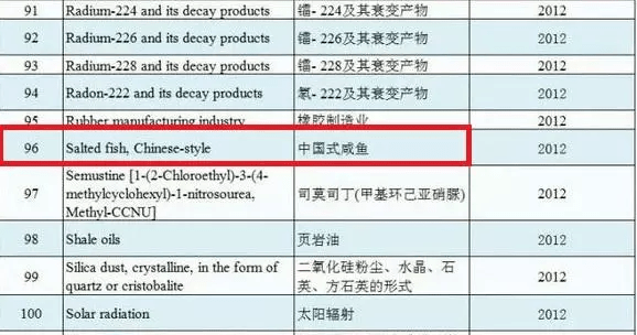 2、中式咸鱼 中式咸鱼是国际公认的一类致癌物,它在腌制和蒸煮的过程中,会产生一种名叫“N-亚硝基化合物”的物质,这种物质对于人类鼻咽癌的风险性很高。 咸鱼的味道实在上头,用来炒饭、配白粥、炒菜都是一绝。难道我们真得要戒咸鱼吗?其实咸鱼虽然有风险,但并不意味着绝对不能吃,只有长期较大量地食用才存在高风险。