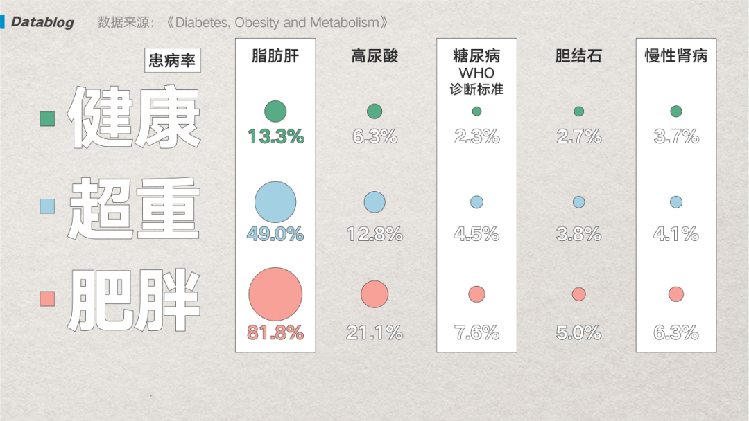 (图/网易数读) 不只是吃得多,中国人也更不爱动了,当“996”成为家常便饭,上班已经耗尽了打工人所有力气,能坚持往健身房跑的都是勇士,每周至少锻炼一次的成年人根本不足 1/4 [11]。 当代人只要有 Wi-Fi 和外卖,完全可以在家“宅一天”,只是光吃不动一时爽,穿衣打扮火葬场,每到捯饬自己的时候就悔恨自己不够努力,但坚持减肥确实是一件困难的事。 因此我们也常常自我安慰,生活已经这么难了,就不要再为难自己了,尤其看完这份 1580 万样本的研究,大家可能从中获得些安慰——变胖的不止我一个,大家都在胖,四舍五入就等于我并没有胖。 只是这种掩耳盗铃的办法,身体可能不会答应。 因为在肥胖的情况下,脂肪肝的患病率是健康体重下的六倍,糖尿病的患病率是健康体重下的三倍,甚至得慢性肾病的概率也会更高些 [4]。