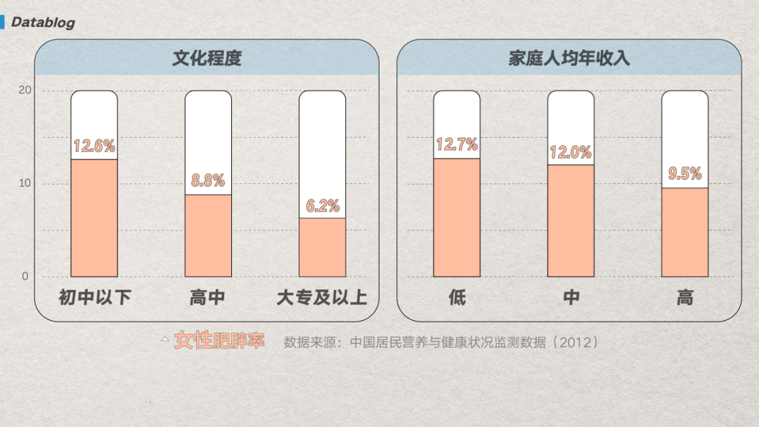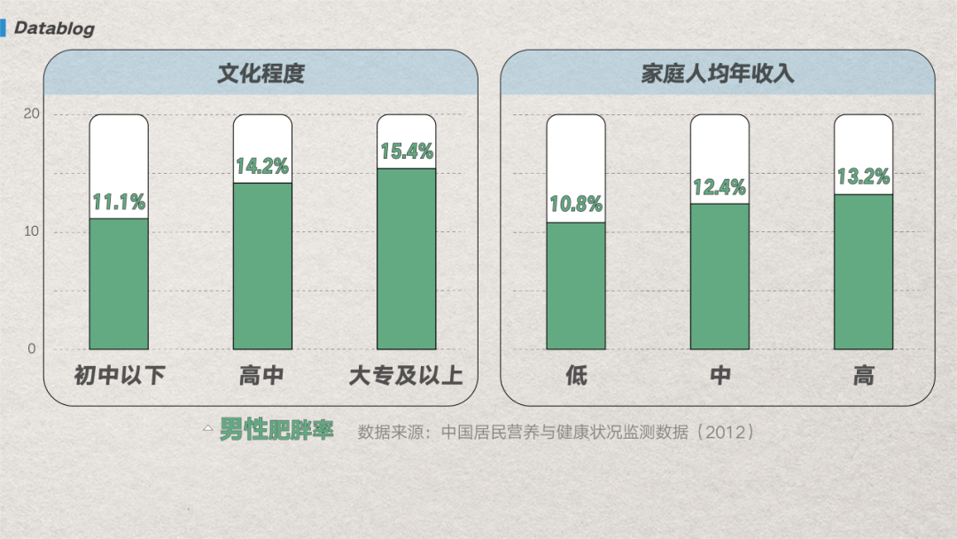 (图/网易数读) 有一个很直观的例子,就像之前热播剧《漫长的季节》中的彪子和丽茹——到了中老年,彪子大腹便便,而丽茹身材并没有走样。这样的胖瘦对照恐怕是不少中国中年男女的缩影。 这个缩影的背后,除了年龄的影响,最主要的还是和缺衣少食的年代相比,现在的生活条件好太多了。但经济条件的改善,在男女身材上又呈现出了完全相反的两种状况。 中疾控营养与健康所曾经做过研究 [9],发现学历更高、有钱的男性群体,要比学历更低、没钱的人更胖。