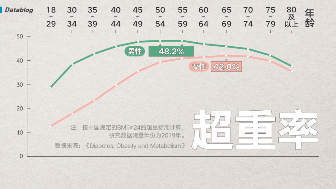 (图/网易数读) 当然,罗马不是一日建成的,此前中国疾控中心发起的跟踪研究显示,2004 年到 2015 年,国人的超重率一直从 31.1% 狂飙到 47.7%,肥胖率从 7.1% 升至 14.2% [6],增长迅速。 而这次《糖尿病、肥胖与代谢》期刊基于近 1580 万样本计算出的年龄标化数据显示,2019 年,有超三分之一的中国人超重,13.7% 的中国人达到肥胖的地步 [4],这意味着将近一半的中国人是超重或肥胖的 。
