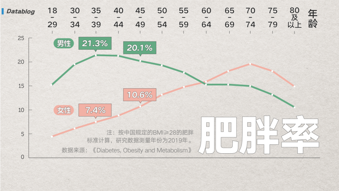 (图/网易数读) 如果看比超重更严重一点的肥胖指标,情况也并没有变。35-39 岁是男性最胖的时期,而这个发福期可以持续到 49 岁,这两个年龄段中,超过 1/5 的男性都身材过胖。 反观同年龄段的女性,肥胖比例控制在 10% 左右 [4]。