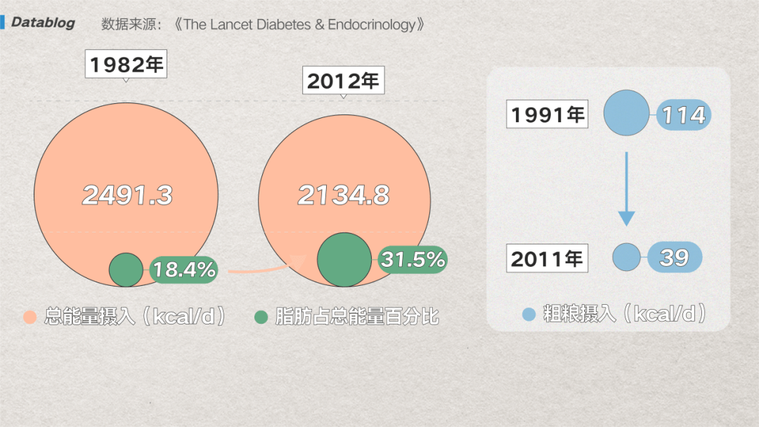 (图/网易数读) 这几个维度对比后,我们能得出一个结论:男性社会经济条件越优渥越胖,而女性则相反。 这或许并不难理解,当女性有钱有闲,不少人会考虑身材管理,高学历中青年女白领大多是健身、轻食、抗糖等减脂生活方式的践行者。 而把饭桌酒桌作为重要交际场所的中年男人,也不受那么严苛的身材凝视,发胖就成为一种难逃的宿命。 光吃不动,小心身体抗议 人长胖,吃得多动得少永远是最简单的解释,对比八九十年代,中国人每天吃进去的热量其实变少了,但每天大鱼大肉的,吃进去的脂肪比例高了近一倍 [10],与此同时促消化的粗粮却吃得不够了。