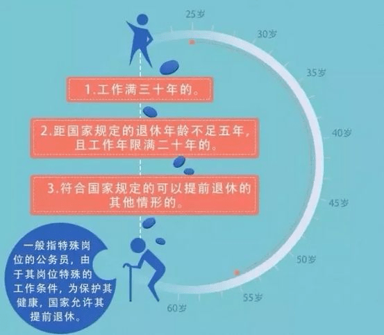 2.特殊工种提前退休 申请特殊工种提前退休的三个条件: 一、参加企业职工基本养老保险累计缴费年限满15年; 二、男满55周岁,女满45周岁; 三、从事特殊工种工作年限须满一定年限,其中,从事特繁重体力劳动累计10年;从事井下、高温工作累计满9年;从事有毒有害环境中工作累计满8年。 办理程序 符合条件的职工,应向单位申请,由单位先公示7天,并进行数据整理后到当地社保局申报。(其中,人事代理或失业人员应由原工作单位申报,原单位没有的由代理机构申报),提交以下材料: 职工本人的书面申请及原始档案; 《缴费人员基本信息核定表》; 《企业执行特殊工种名录基本情况登记表》; 《从事特殊工种职工花名册》; 《关于申报特殊工种退休会审的申请》; 职工身份证复印件; 《公示证明》。 社保局受理相关材料后,进行会审,通过的,会及时联系报送单位办理提前退休手续。 二、公务员 公务员两种退休方式: 一种是法定退休,即达到法定的退休年龄,由任免机关命令其退休;一种是自愿退休,即具备了法定的最低退休条件之后,可自愿申请退休。 国家公务员自愿退休的条件是:符合下列条件之一的,本人提出要求,经任免机关批准,可以提前退休: (1)男年满55周岁,女年满50周岁,且工作年限满20年的; (2)工作年限满30年的。确立自愿退休的方式,这在我国还是第一次,也是国家公务员退休制度的一个新的特点。这样可以使部分服务年限较长、而又未到法定退休年龄的国家公务员根据自己的意愿,提前退休。 办理程序 国家公务员管理部门要依法按照规定的程序,及时为符合退休条件的国家公务员办理退休手续,一般应在国家公务员具备了退休条件的当月通知本人,办完手续。 对自愿退休的,应由本人提出申请,经任免机关批准,再办理退休手续。 03.提前退休是好是坏? 提前退休一定是好事吗?对于劳动者来说,提前退休究竟是好是坏呢? 一、从身体状况的情况考虑,好处>坏处 1、因病或者是外因致残 丧失了劳动能力,提前退休或许是最好的选择。除此之外,也没有别的更好的选择,提前退休也是无奈之举! 2、从事特殊工种 特殊工种从事者,多年的从业环境,对身体的危害很大。比如:从事井下就业,长期处于一个恶劣环境,身体也会受环境影响,矽肺就是我们常见的职业病,恶劣环境引起的改变是不可逆,我们能做的就是在改变发生之前做好预防。 提前退休也是考虑到上述的因素,在职业病发生之前,提前退休,领取养老金,提前享受生活。 身体不错的话,也可以自己找份兼职,赚两份工资! 二、从养老金领取多少考虑,坏处>好处 养老金肯定是多交多得,长缴长得。 1、提前退休势必会导致养老保险缴纳年限少于正常退休职工养保险,养老金肯定会低于正常退休养老金。 2、提前退休养老金每年调整比例低于正常退休调整比例。 养老金调整中一项是根据缴费年限进行调整,提前退休养老金上涨的少,正常退休上涨的多! 可见,提前退休是一把双刃剑,毕竟多缴多得的大环境下,养老金保障还是要靠我们自己。 最后,听到这个消息,你怎么看? 来源:山西省人社厅网站