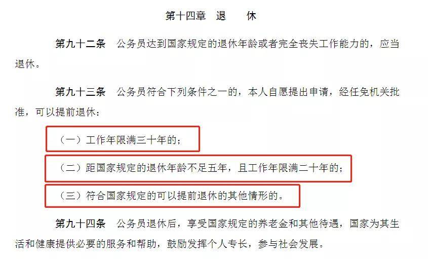公务员法第九十三条明确规定: (1)工作满三十年的,可以申请提前退休。 (2)距国家规定的退休年龄不足五年,且工作年限满二十年的。 (3)符合国家规定的可以提前退休的其他情形的。这种情况一般是指特殊岗位的公务员,由于其岗位特殊的工作条件,为保护其健康,国家允许其提前退休。