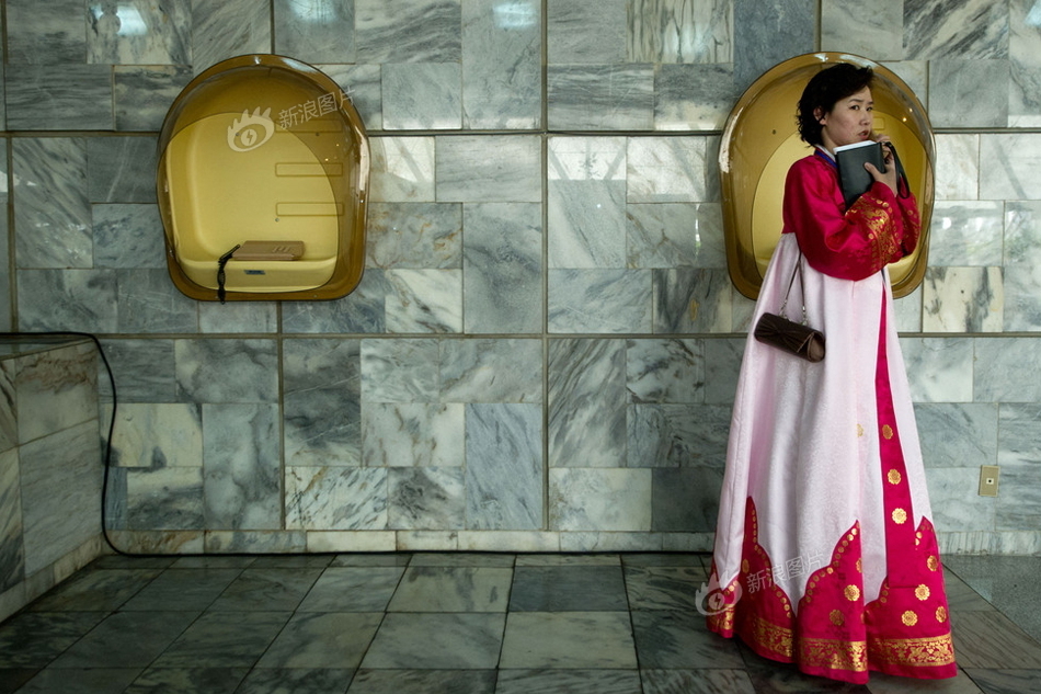 2012年4月13日,朝鲜平壤,一名穿传统服装的妇女在羊角岛国际酒店里打手机。近两年来,这里已渐渐不再是外国人的专属之地,很多朝鲜人也开始频繁进出,使用外币吃饭、娱乐、消费。