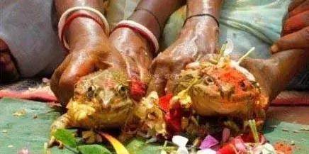 2004年,尼泊尔一名75岁的老人根据当地习俗为了祈求好运,与一只狗举行了婚礼。但是这个办法似乎并不奏效,三年后,老人就死了。 据说,他们族中曾经有一名老者在娶了狗新娘之后,重新长了牙,自此以后这个习俗就流传了下来。 10、2009年,7岁印度女孩与青蛙的婚礼