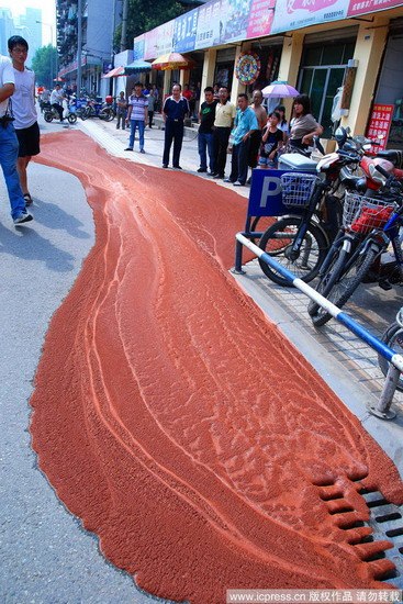 泥浆蔓延在公路上,形成一道约10米长的红色“泥龙”。 2010年6月17日下午3时许,成都市陈家巷公交站台附近的路面突然出现异象,路面莫名其妙向上凸起,随即出现一条长长的缝隙,缝隙处冒出鸡蛋大小的气泡,红褐色的泥浆从缝隙处冒出来。 2010年6月17日下午3时许,成都市陈家巷公交站台附近的路面突然出现异象。周围群众推测:也许和附近正在施工的工程有关。 现场:突然出现异常现象,吓得群众赶紧躲避。 凸起的路面长约5米,宽约2米,凸起处最高有30厘米左右,呈半椭圆状,中央有一道长约2米的细小裂缝,红褐色的泥浆伴随着气泡流出,泥浆蔓延在公路上,形成一道约10米长的红色“泥龙”。 “这个场景跟电影《2012》一样,有点吓人!”附近彩票店工作人员梁大姐说,“下午3点左右,门前的路面上突然冒起了气泡,鸡蛋一样大小,然后不断冒出红褐色的泥浆,不到几分钟,泥浆就流了一大片,同时路面也一点点向上凸起。” 梁大姐说,“周围群众赶忙往远处躲,怕出现更大的开裂。” 市民许先生则说,用力踏上凸起的路面,双脚能感觉到路面下明显的震动。“路面下好像是空的!”一市民说,“就怕凸起的地面突然塌下去!” 解释:施工中出现的正常现象,不会影响周边群众生活。 下午4时许,清洁公司工作人员利用高压水腔对路面泥浆进行冲洗。但这边尚未被清理干净,那边又冒出新的泥浆。下午4点30分左右,泥浆冒出速度逐渐减慢,只是从缝隙中少量渗出。随后,凸起路段被警戒线和锥形警示筒“包围”。 对这一异象,附近市民表示不解,一些人怀疑与附近工程施工有关。附近工程一名工作人员查看现场后表示:这是施工中的正常现象,不会出现大问题,不会影响周边群众的生活。