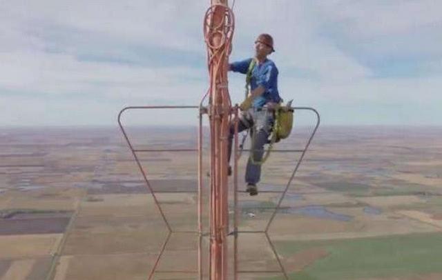 这份高空作业的薪酬是日结的,换这种灯泡的作业是不常见的,而这钱也不是那么好赚的,图中这名美国男人戴上一条安全绳就开端往上爬,上到460米高塔就花费了2个小时。