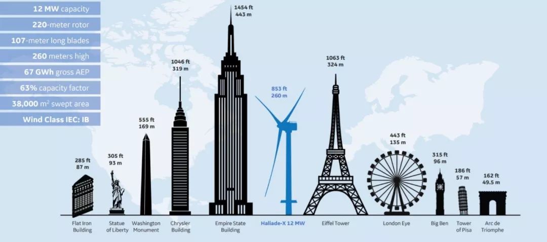 Haliade-X风机高达260米,相当于一座86层的高楼(按每层3米约算),叶片长107米,发电量可达到12兆瓦,比目前业内9.5兆瓦的最高发电量还要高出26%。