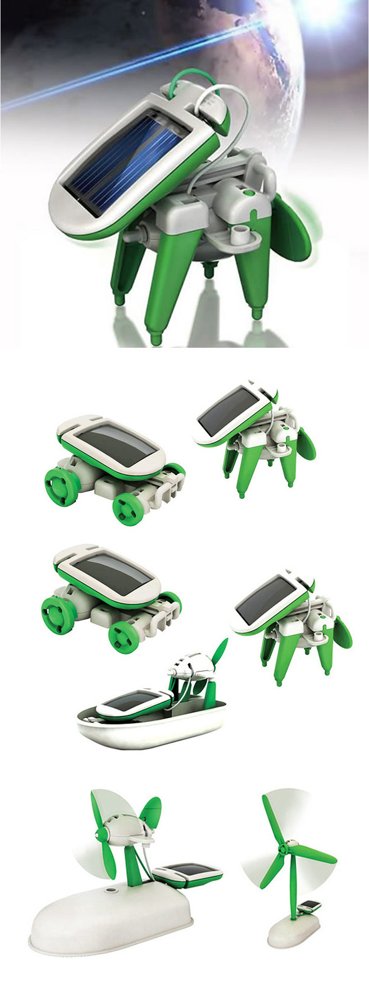 通过套装中的25个零件,一分钟之内就能组装成一台机器狗,或者是泡澡时候可供孩子玩耍的快艇,还有汽车、风车和两款飞机。整个装备过程跟乐高玩具一样,不需要螺丝,而机器人的驱动也都仰仗太阳能。