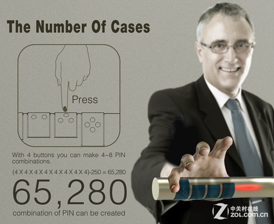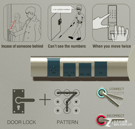 为了安全,很多地方都会入口处设置电子门密码,以防止不速之客的进入。然而通过看电影我们就知道,这样的密码锁并不安全,无论是数字密码锁还是图形密码锁,都可以被别人轻松记下,设置通过按钮上的痕迹就可以很快猜出密码!为了让密码锁真的起到安全的作用,也为了方便用户开门,Kwon Hyuk sang设计了这个密码门把手。它巧妙的将密码和门把手结合在了一起,在门把手的下方有四组很小的按钮,用户只要分别按对各个区域的密码数字才能打开密码门。这样设计很好的避免了密码泄露,打开也更加方便,甚至盲人用户也可以顺利打开。