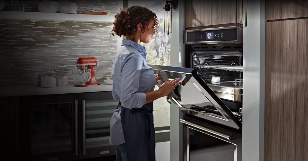 Temi是一款多用途家用智能机器人,高约1米,配备一块10英寸的高清LCD显示屏,自带载物托盘,可自由移动的轮子隐藏在底座下方,兼具实用性与极简的科技外观设计。 KitchenAid 智能烤箱