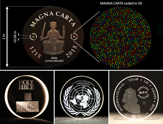英国南安普顿大学科学家已开发出一种新的数据存储技术,利用玻璃中的微型纳米结构去编码信息。 基于这一技术,标准尺寸光碟能保存约360TB的数据,而在温度高达190摄氏度的环境中可维持长达138亿年。这一时间与宇宙的历史相仿,达到地球年龄的3倍。 插播:存储360TB@深科学简单说 这一技术被称作“五维数据存储”,最初发表在2013年的一篇论文中。自那时以来,科学家仍在继续对技术进行优化。目前,科学家计划进一步推动这项技术的发展,甚至实现商用。参与这项研究的研究生艾比德·帕特尔(Abid Patel)表示:“我们可以编码任何信息。我们没有局限。只要给我们文件,我们就能将文件录入光碟。” 5D“光碟”存储器制造过程 为了展示这一数据存储技术的优势,南安普顿大学团队将英皇钦定本圣经、牛顿的《光学》一书(光学和透镜理论的基础),以及联合国《世界人权宣言》用这一技术进行了记录。研究团队负责人皮特·卡赞斯基(Peter Kazansky)教授将在旧金山的光学工程学会会议上发表关于这一技术的最新论文。 对于这种光碟存储信息的方式,可以将其与普通CD进行对比。CD光盘上有凹凸不平的线条,可以被激光读取。当激光探测到凸起时,那么就代表数据“1”,而如果没有凸起,那么就代表数据“0”。这是一种二维的数据表达方式。基于这种方式,CD可以保存各种信息,无论是音乐、图书、照片、视频,还是软件。然而,由于这些微小凸起位于CD表面,因此很脆弱。物理磨损,以及暴露在有氧、高温、高湿的环境下都会给数据造成破坏。 五维光碟能使用位于碟片内的微型物理结构,即“纳米格栅”去保存信息,而通过读取折射的激光可以表达5种数据状态。这也是这种技术名称的来源。利用激光技术,设备可以知道纳米格栅的方向、激光折射的强度,以及用X、Y、Z轴表示的空间中位置。因此,相对于传统光碟,五维光碟的数据存储密度更大;蓝光光碟可以保存128GB的数据,而五维光碟存储的数据量可以达到蓝光的近3000倍,即360TB。