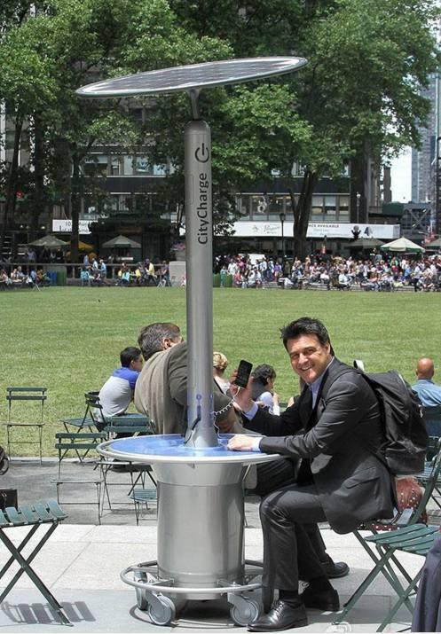 我们去旅游或者出差最烦人的是紧急关头手机没电了,虽说可以带个移动电源,但现实是很多人都不喜欢随身带个移动电源的。近日,纽约 Bryant 公园里就放置了一个太阳能手机充电桩。