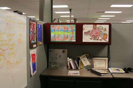 设计中心一个工位上的涂鸭出自这个员工的孩子之手 戴尔首席设计师Ken把媒体带到设计中心。一个陈列室里放着已经推出的和考虑推出的外壳样本。他们把材料做成像肥皂泡一样的特殊形状,以便于一下子就可以看到材料在不同角度下的质感。他们还请了一些有名的艺术家为外壳设计图案,并且拥有这些图案的版权。目前戴尔已经有100个专业的设计师,他们的工位都个性实足。 花絮