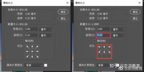 2、选择图像—画布大小,增加画布高度,这里我将画布增高到了8.23cm,中间点移至上面中心,让画布向下扩展,点击确定。