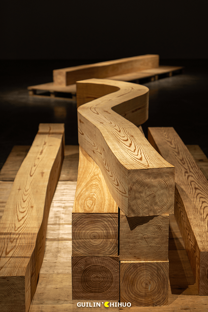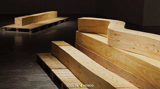 虽然在静态下它们的轮廓、颜色并没有改变,看似“徒有其表”而被错认为是“石膏像”,但内里却有了质的变化,人为的参与使凝固的造型转变为可以拉伸、扭转、变化的可动雕塑,改变了原本静态的空间和体量。 ○《自然系列——木方》