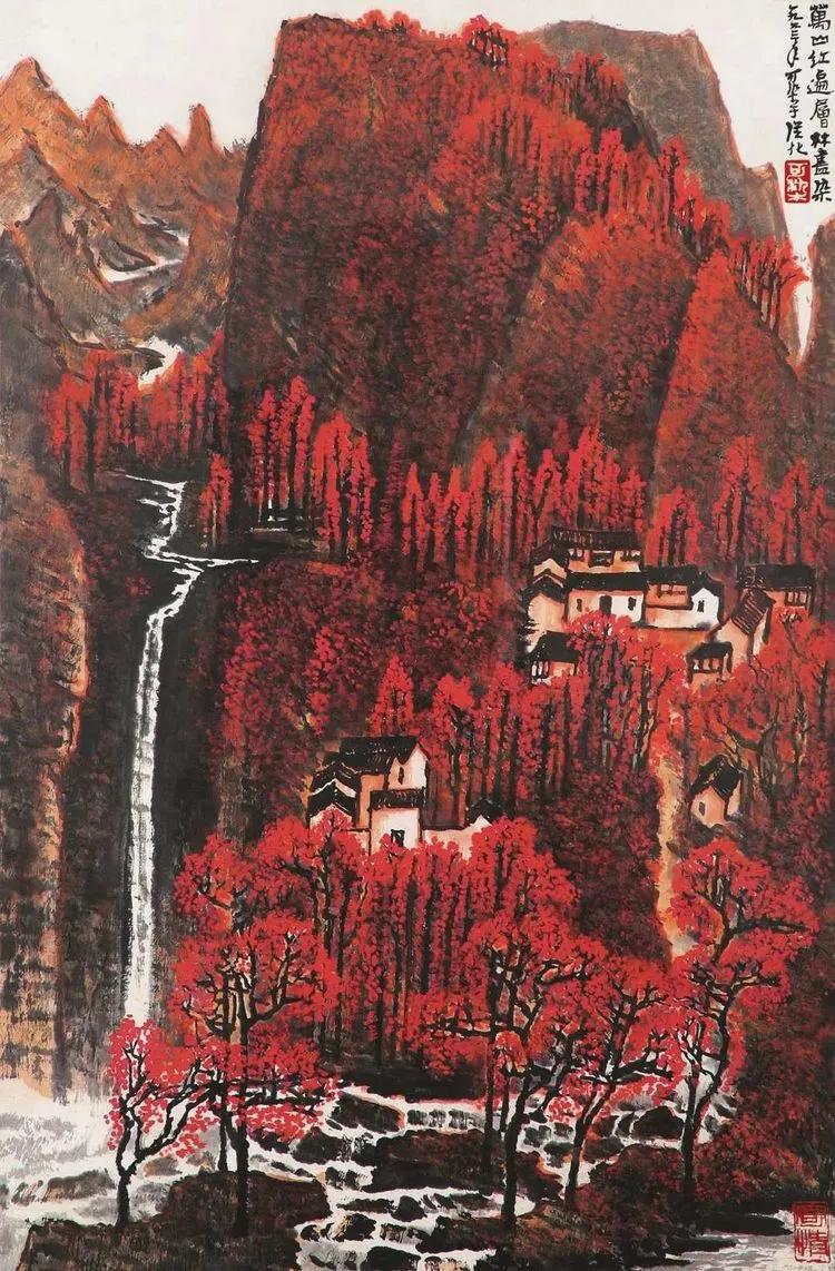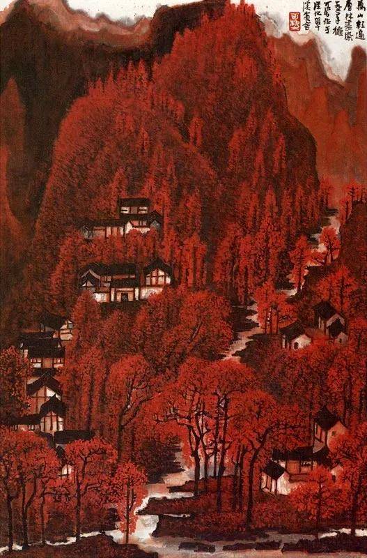 右上角题款为“万山红遍层林尽染,一九六二年秋,可染作于从化翠溪宾舍”,此画以墨作底,红为主调,强调“遍”字。以朱砂色铺陈整个画面,可谓大胆创新之举,使画面滋润明亮富有层次变化。