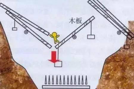 地宫中大量储注水银,或许也有以剧毒汞蒸气杀死盗掘者的动机。以当时人对于水银化学特性的认识而言,不会没有注意到汞中毒的现象,而利用水银的这一特性用于防盗设计,也是很自然的。 六、连环翻板 连环翻板,即在陵墓墓道中挖掘深约3米以上的陷坑,长短与宽度视墓道具体情形而定,坑下分布约10厘米左右的刀锥利器。
