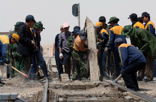 青藏铁路建设者在西藏桑典康桑雪山脚下整道(2005年6月8日摄)。新华社发 历史曾写下这样一组数据: 1973年到1984年,建设青藏铁路一期时,铁道兵七师和十师的10个团在这里共留下了10个烈士陵园,约有400多名战士长眠在这八百里瀚海中。 1954年12月25日通车的川藏公路在建设中共死亡4000多人,平均每公里竖着两座墓碑。 1998年峻工、由上万名建设者建成的兰—西—拉光缆工程,也付出了沉重的代价。 有很多流行在青藏公路沿线的顺口溜读来令人心惊:“到了西大滩,两眼泪不干”,“到了昆仑山,如进鬼门关”,“到了五道梁,难见爹和娘”,“到了唐古拉,死神把手抓”…… 在这样一个人类生命禁区,怎么保障施工者的生命安全? 就在青藏铁路开工前,两件事引起了铁道部领导的高度警觉。 铁道第一勘测设计院青藏线初测人员在现场指挥长李金城的带领下,于2000年进入现场。9月8日,在对无人区线路的勘测时,遭到暴风雨袭击,被困两天一夜。气温在零下20多摄氏度,天黑得伸手不见五指,他们不得不在泥泞的沼泽中摸黑前进。李金城由于身体缺钾,加上连日来的过度疲劳,躺在沼泽里站不起来,他要求把自己留下,其他同志继续想办法走出无人区,天亮了再派人接他。 2001年4月,担负青藏铁路勘测设计任务的铁道第一勘察设计院所属兰州分院第三勘探队304机组,在山口进行隧道地质钻探,为即将开工的青藏铁路进行着最后的准备工作。就在这个工点上,304机组雇用的协议工,仅仅在工地上干了两天,就因高原环境恶劣,连工资都不要,就带着对高原病的恐惧连夜悄悄下了山。 青藏铁路还没上马,如此状况怎能保证建设一流高原铁路?