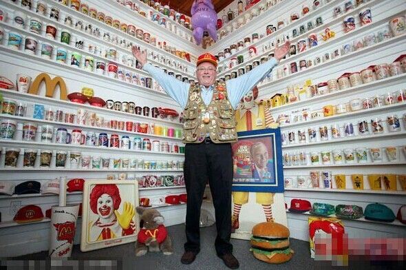 4、麦当劳收藏家 美国宾夕法尼亚州60岁的老人迈克方丹(Mike Fountaine)花费近半个世纪,收藏了7.5万件世界著名餐厅的纪念品,其中包含11700枚麦当劳徽章和几乎所有的开心乐园餐厅玩具。