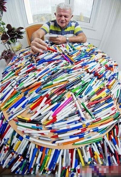 8、促销笔收藏家 70岁的匈牙利退休教师Tibor Nogell 从30岁开始收集各色促销笔,至今共收集了来自英国航空、箭牌、西门子等全球各公司共1255支促销笔。将这些五彩缤纷的笔放在一起,那场面还真是十分的壮观呢!