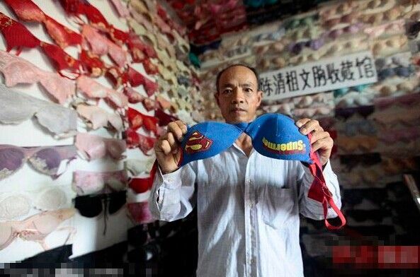5、文胸收藏家 三亚市崖城镇,陈清祖花费20年时间收集5000余件文胸,在一间栋不起眼小房间的墙壁上、天花板上挂满了各式各样的女性文胸,数量多达5000余件,而这些令人目不暇接的“藏品”来自全国30多所高校的女生。