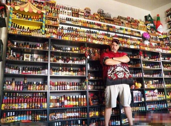 10、辣味调味品收藏家 美国亚利桑那州凤凰城,45岁的Vic Clinco拥有世界上可能是最多的辣味作料收藏。他大约收藏了6000瓶辣味调味品。Vic Clinco收集这样的调味品已经有17年的时间,他甚至拥有吉尼斯纪录认证的世界最辣调味品。