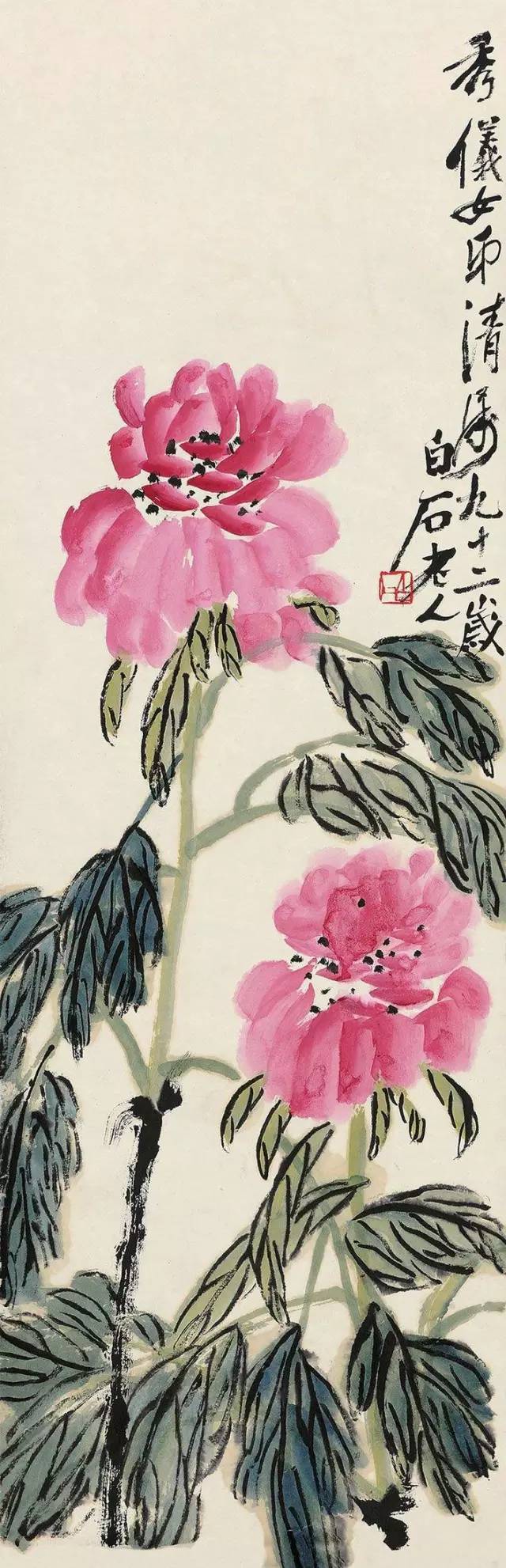 齐白石主张艺术“妙在似与不似之间”;衰年变法,绘画师法徐渭、朱耷、石涛、吴昌硕等,形成独特的大写意国画风格,开红花墨叶一派,尤以瓜果菜蔬花鸟虫鱼为工绝,兼及人物、山水,名重一时,与吴昌硕共享“南吴北齐”之誉;以其纯朴的民间艺术风格与传统的文人画风相融合,达到了中国现代花鸟画最高峰。篆刻初学丁敬、黄小松,后仿赵撝叔,并取法汉印;见《祀三公山碑》、《天发神谶碑》,篆法一变再变,印风雄奇恣肆,为近现代印风嬗变期代表人物。其书法广临碑帖,历宗何绍基、李北海、金冬心、郑板桥诸家,尤以篆、行书见长。诗不求工,无意唐宋,师法自然,书写性灵,别具一格。其画印书诗人称四绝。一生勤奋,砚耕不辍,自食其力,品行高洁,尤具民族气节。留下画作三万余幅。