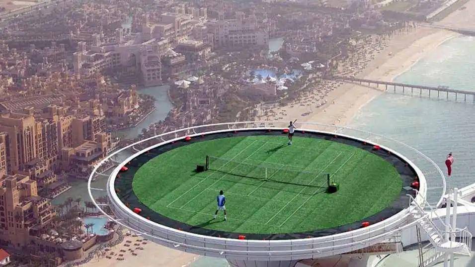 世界上没有一块网球场的视野能堪比迪拜阿拉伯塔酒店的“空中网球场”。2005年2月,头号网球运动员费德勒和阿加西在211米高、被临时改装成草地网球场的直升机坪上进行一场表演赛。由于直升机坪边缘没有装设栏板,所以如果球员打出得分球,网球便会掉入海中。 “这绝对是一次令人难忘的经历。”第一次来到中东参赛的阿加西掩饰不住内心的激动,在比赛之余,阿加西还趴在停机坪边,俯瞰整个迪拜的美景。 比利时布鲁塞尔原子塔