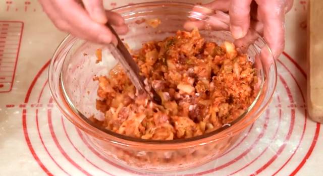2. 泡菜切碎,混合到肉馅中,用筷子搅拌均匀。