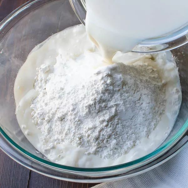 2. 加入牛奶,继续搅拌,将蛋液过筛。过完筛后加入面粉,快速搅拌避免出现很多小疙瘩。