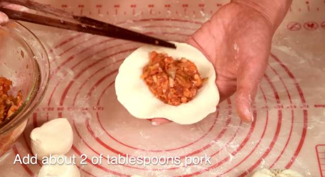 5. 包出包子的形状。放入自己喜欢吃的包子馅儿,素的肉的都可以,想包出漂亮的圆褶形状,手法如下。